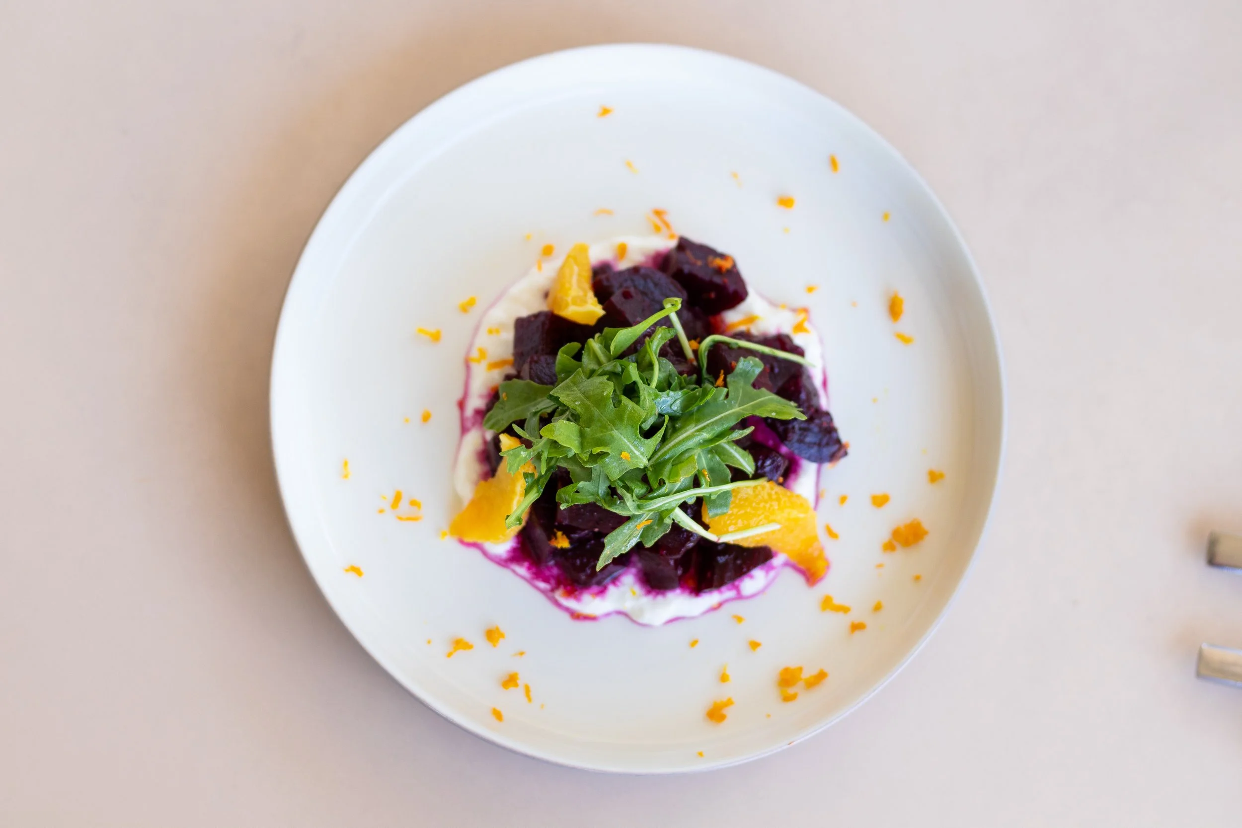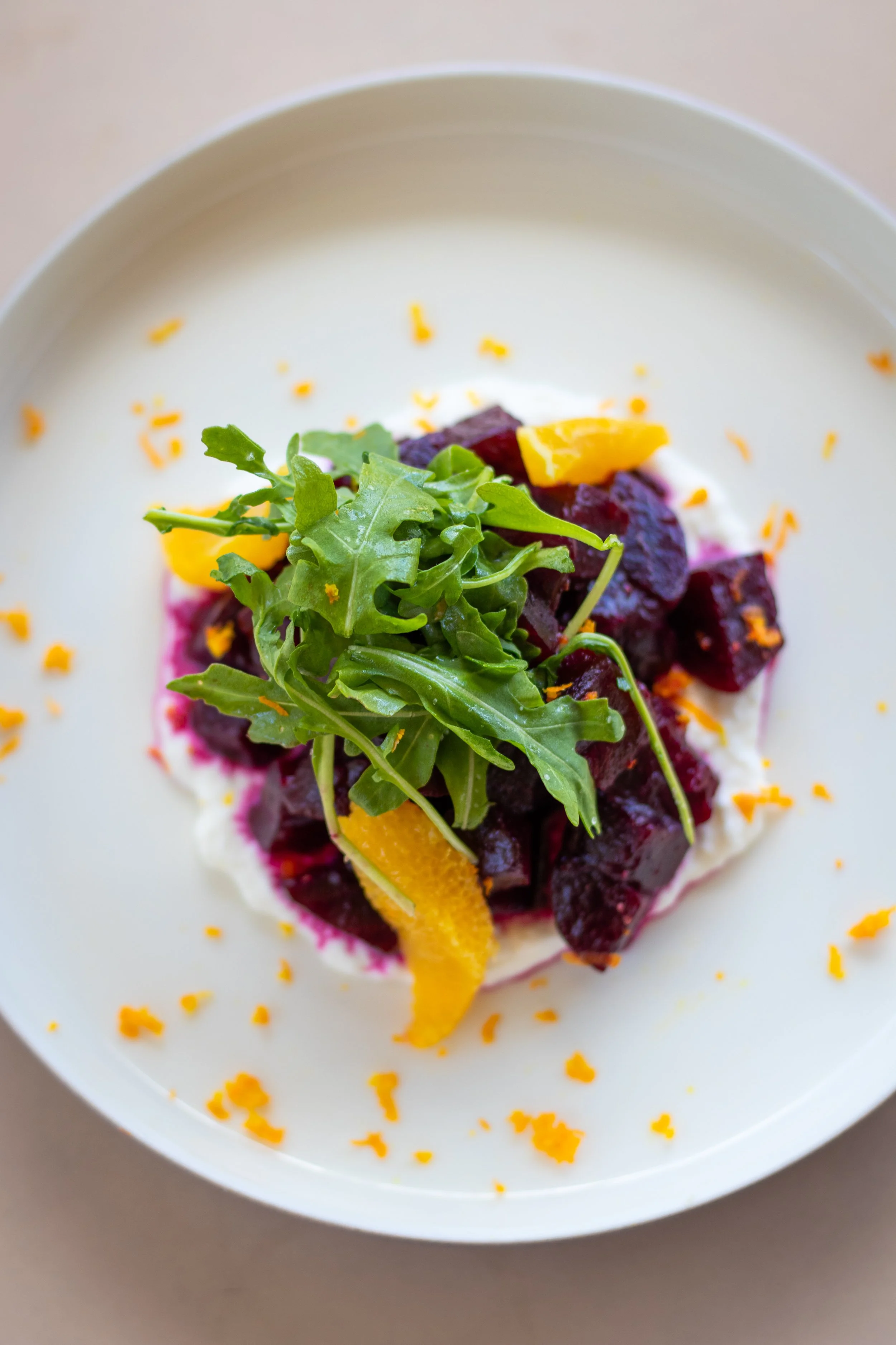Beet salad garnished with arugula, orange slices, and orange zest on a white plate